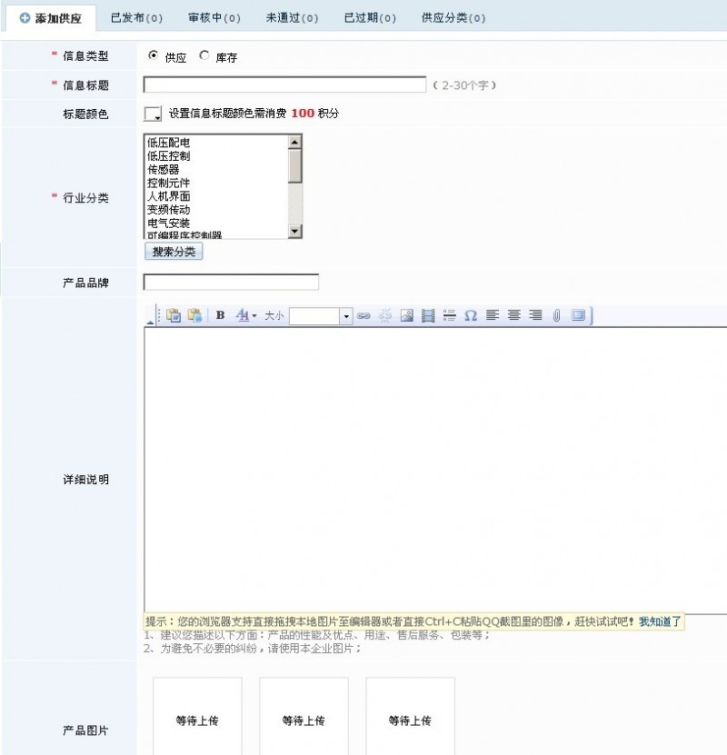 2、 點(diǎn)擊添加供應(yīng),進(jìn)入產(chǎn)品供應(yīng)信息添加頁(yè)面: 3、填寫(xiě)好信息后,點(diǎn)擊保存等待審核即可。