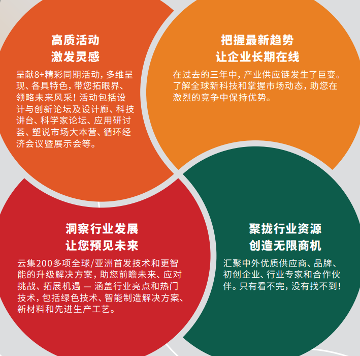 闊別六年,“CHINAPLAS 2024 國際橡塑展”將于2024年4月23 - 26日強勢回歸上海·虹橋·國家會展中心。展會集中展示塑料和橡膠高端制造、智能制造以及綠色制造的頂尖智慧成果,為各應用領域的專業人士提供探索創新、提升技能、提高效率及迅速應對市場走向的解決方案,以科技創新這把“金鑰匙”激活橡塑高質量發展的新動能。