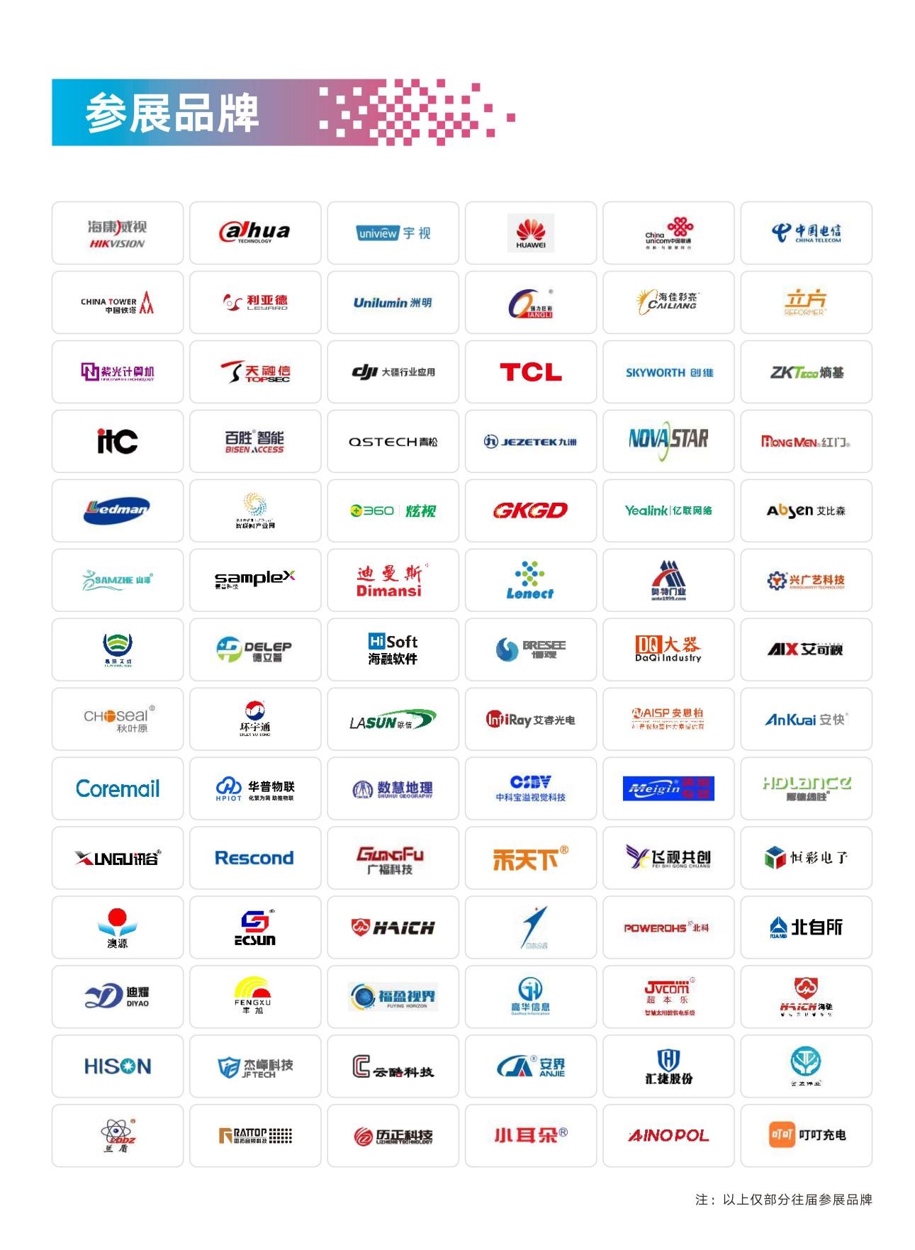參展企業包括中國移動、中國聯通、中國電信、中國鐵塔、?低、華為、宇視、大華、科大訊飛、天融信、利亞德、洲明藍普、立方、雷曼、強力巨彩、海佳彩亮、奧特、紅門、百勝、興廣藝、廣福、創維、TCL、賽普、九洲、諾瓦星云、Itc、億聯、LASUN(聯信)、綠聯、唯格、山澤、銳康、訊谷、美晶等。更多智能化、數字化產品技術亮相現場,包括智慧城市、人工智能、大數據、物聯網、數字安防、數字消防等。