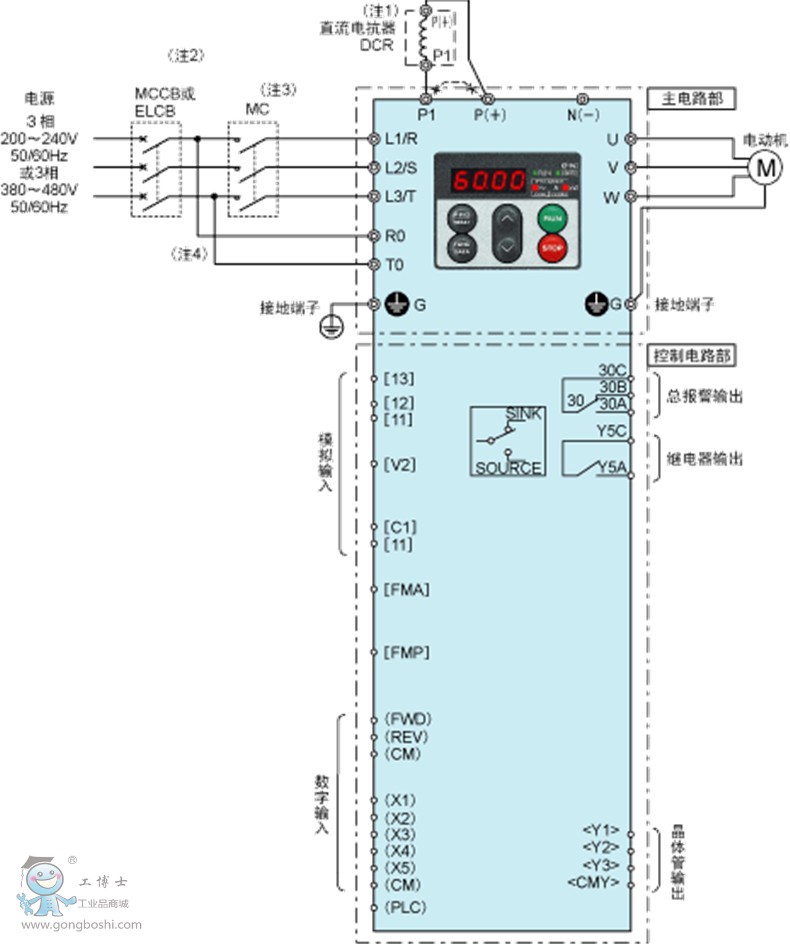 注4) 如果希望變頻器的主電路電源處于開放狀態時只有控制電路運行,且變頻器處于待機狀況的話,請連接此處。只需完成主電路部分的排線,無需連接主端子就能讓變頻器運行