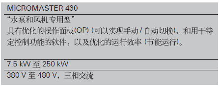----MicroMaster430是全新一代標(biāo)準(zhǔn)變頻器中的風(fēng)機和泵類變轉(zhuǎn)矩負(fù)載專家。功率范圍7.5kW至250kW。它按照專用要求設(shè)計,并使用內(nèi)部功能互聯(lián)(BiCo)技術(shù),具有高度可靠性和靈活性。控制軟件可以實現(xiàn)專用功能:多泵切換、手動/自動切換、旁路功能、斷帶及缺水檢測、節(jié)能運行方式等。