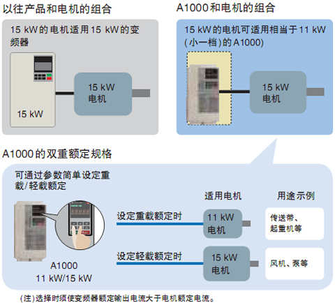 | 采用1臺變頻器即可選擇輕載(ND)、重載(HD)額定的雙重額定規格。根據電機的用途,有時可使用小一檔容量的變頻器。 |