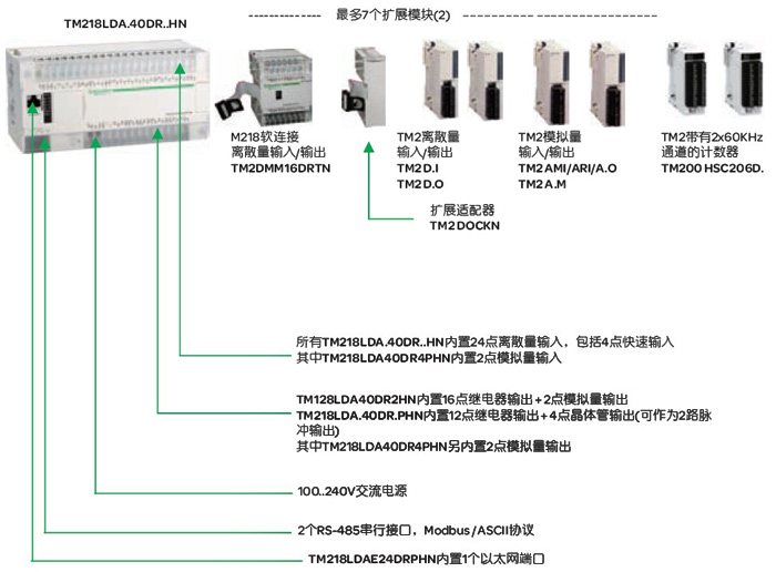 ●內置40點I/O的控制器TM218LDA.40DR..HN*多可以擴展7個擴展模塊。