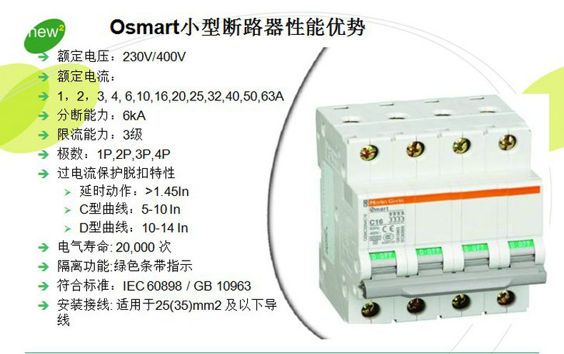 新一代的osmart系列小型斷路器擁有更加完善的電流規格, 更加簡明的選型標注,為OEM客戶度身定做的特色系列標識和特色包裝, 更加齊全的附件系列…它在設計過程中,充分考慮了工業控制和原始設備制造商的需求和市場特點,憑著Merlin Gerin 領先的技術和成熟的經驗,以產品的可靠性和高質量為重,同時注重實用性和安裝方便。