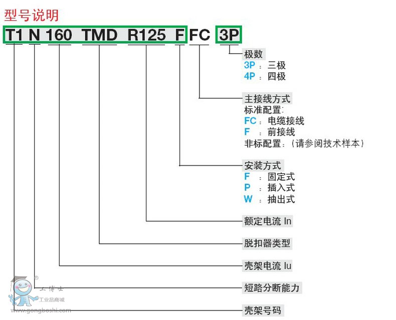 全部3極和4極斷路器均有固定式;其中,T2、T3、T4和T5還具有插入式,而T4、T5、T6和T7更具有抽出式。