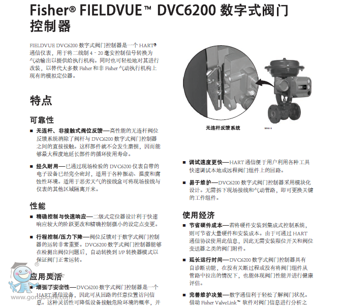 Fisher® FIELDVUE™ DVC6200 數(shù)字閥控制器是基于微處理器的電流到氣動信號的 HART® 通信儀表, 具有連接少、無接觸行程反饋的特點(diǎn)。DVC6200 儀表執(zhí)行三項(xiàng)重要功能: