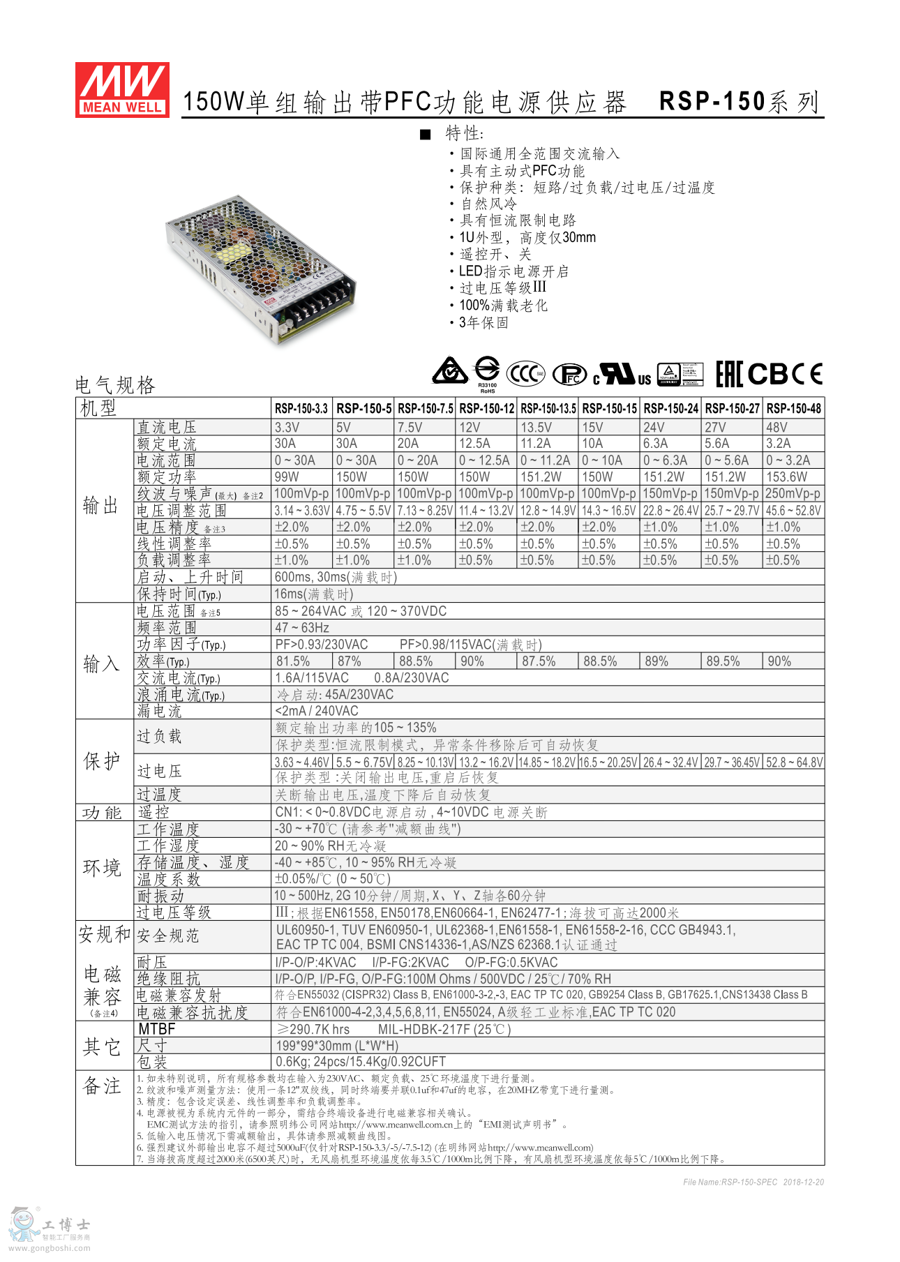 明緯開關電源RSP-150-24 24V6.3A