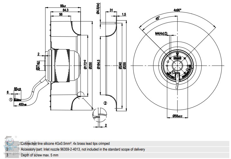 離心風機將空氣沿著電機軸向吸入,并沿著電機徑向排出。離心風機的特點是壓力升高快,這主要依賴于葉輪的寬度、空氣性能特性和適當的大流量。空氣流量符合相似定律,在壓力相同和流速恒定的條件下,流量隨著葉輪寬度的增長成線形變化。