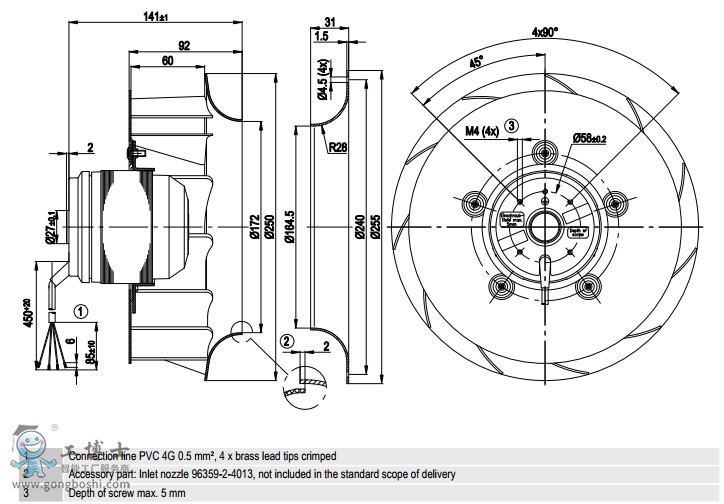 離心風機將空氣沿著電機軸向吸入,并沿著電機徑向排出。離心風機的特點是壓力升高快,這主要依賴于葉輪的寬度、空氣性能特性和適當的大流量。空氣流量符合相似定律,在壓力相同和流速恒定的條件下,流量隨著葉輪寬度的增長成線形變化。