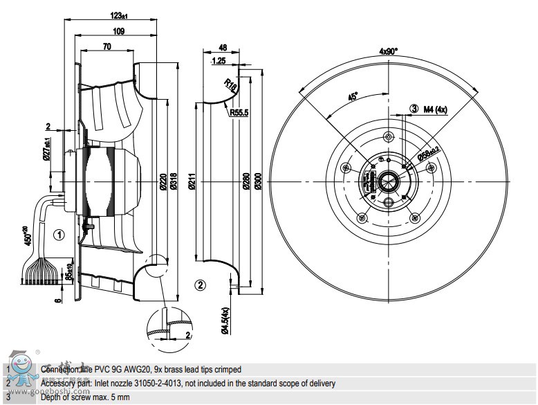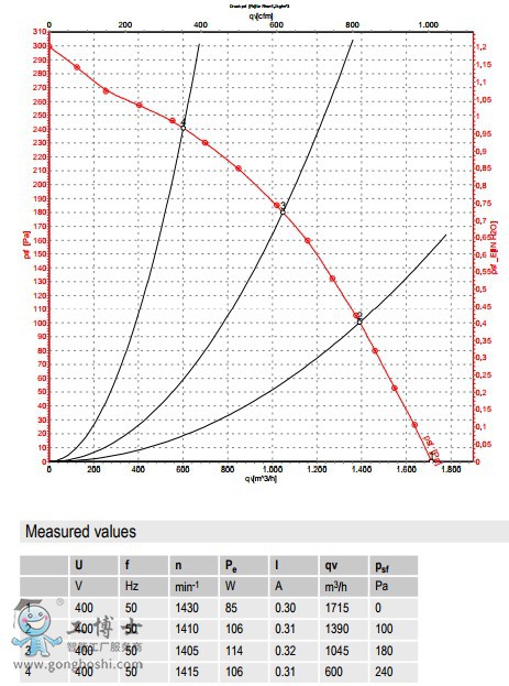 離心風機將空氣沿著電機軸向吸入,并沿著電機徑向排出。離心風機的特點是壓力升高快,這主要依賴于葉輪的寬度、空氣性能特性和適當的大流量。空氣流量符合相似定律,在壓力相同和流速恒定的條件下,流量隨著葉輪寬度的增長成線形變化。