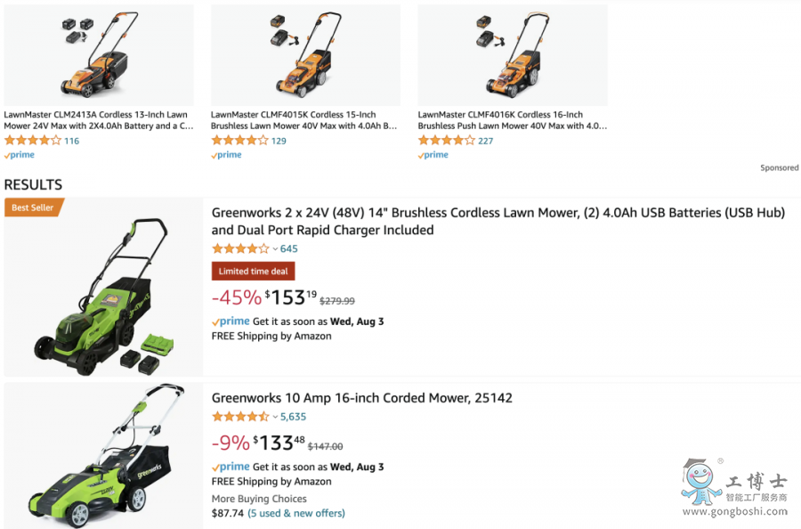 亞馬遜上搜索“割草機”的結果顯示