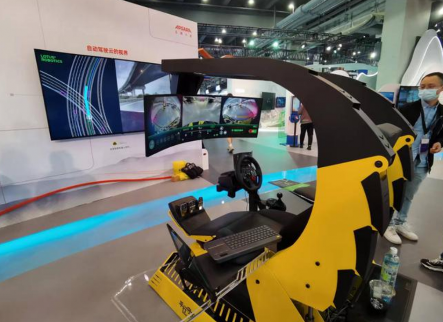 在“計算之力”展館,“遠程駕駛”再一次打開人們的想象空間。體驗者可以在遠程駕駛操縱平臺上,通過操縱方向盤、腳剎、油門等,進行汽車的遠程操控;而平臺界面的顯示也非常像市面上的很多賽車游戲。