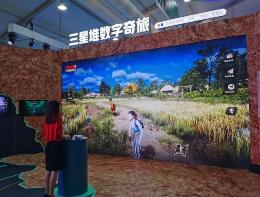富有神秘色彩的三星堆遺址始終牽動著人們的好奇心,而通過數字技術,觀眾也可以“親身”參與到三星堆的考古與探險中。體驗者佩戴VR眼鏡,在地圖中進行參觀,像玩游戲一樣進行“云考古”。