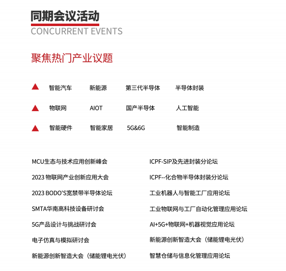 同期聚焦行業(yè)熱點(diǎn),舉辦超50場熱門會(huì)議活動(dòng)。“2023 Bodo’s寬禁帶半導(dǎo)體峰會(huì)”、“2023 MCU技術(shù)及智能家居應(yīng)用”、“2023 物聯(lián)網(wǎng)產(chǎn)業(yè)創(chuàng)新應(yīng)用大會(huì)”、“ICPF-SiP及先進(jìn)封裝分論壇”、“ICPF--化合物半導(dǎo)體封裝分論壇”、“汽車電子采配對(duì)接會(huì) ”等主題論壇覆蓋電子產(chǎn)業(yè),匯聚了行業(yè)內(nèi)的領(lǐng)袖,暢談產(chǎn)業(yè)發(fā)展,市場趨勢、技術(shù)應(yīng)用等熱點(diǎn)。