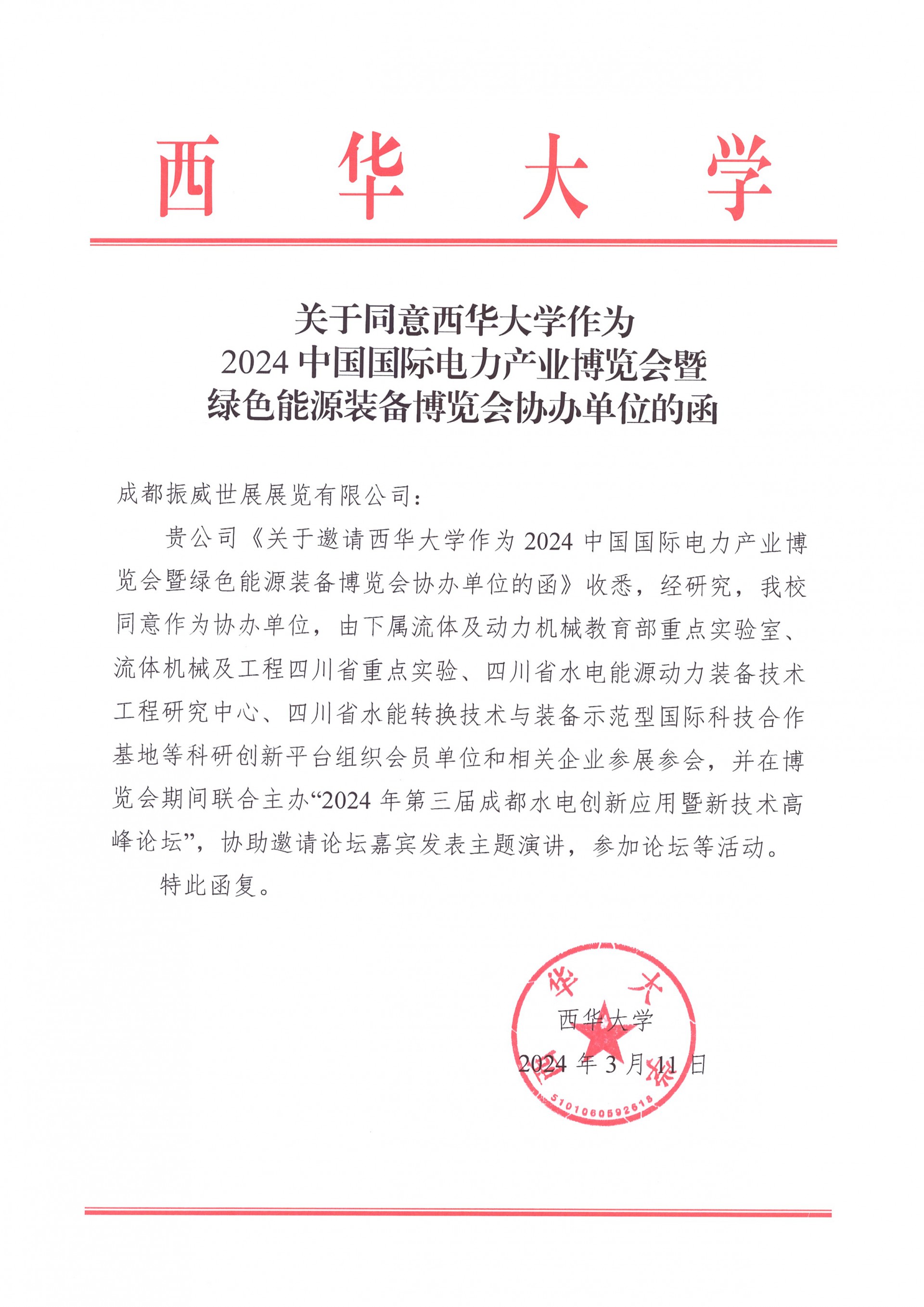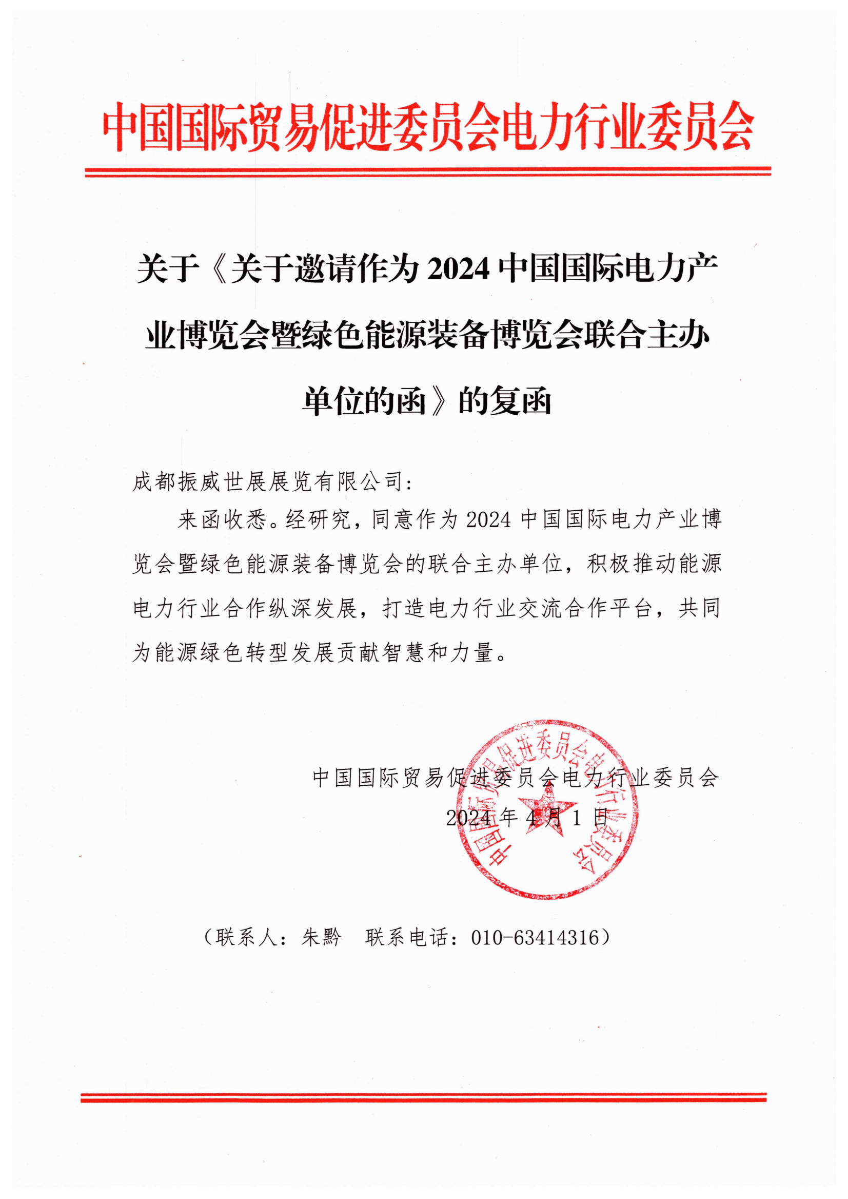 4月1日,中國國際貿易促進委員會電力行業委員會正式復函,同意作為2024中國國際電力產業博覽會暨綠色能源裝備博覽會的聯合主辦單位,將積極組織會員及相關單位參展、參觀,與成都振威世展展覽有限公司共同打造世界領先的電力能源行業“風向標”交流合作平臺。