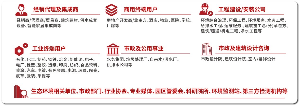 無論您是傳統的經銷商、代理商、市政單位、污水廠、供水廠、水司、工程(安裝)公司、設計院還是來自冶金、石油、化工、食品、制藥、建筑、市政、學校、房地產開發商、酒店等領域的采購商,都將在這場展會中找到屬于自己的商務合作機會和市場拓展空間。