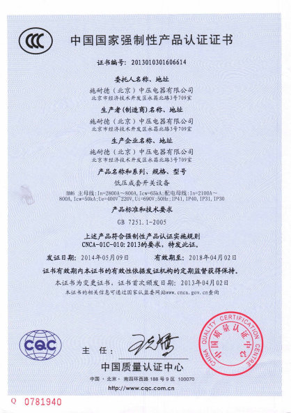 施耐德北京中壓電器_認證證書 中國國家強制性產品認證證書 委托人名稱、地址 施耐德北京中壓電器有限公司 北京市經濟技術開