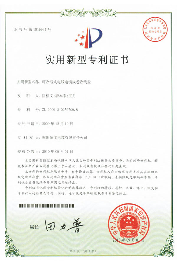 衡陽(yáng)恒飛電纜有限公司獲取各項(xiàng)專利證書。