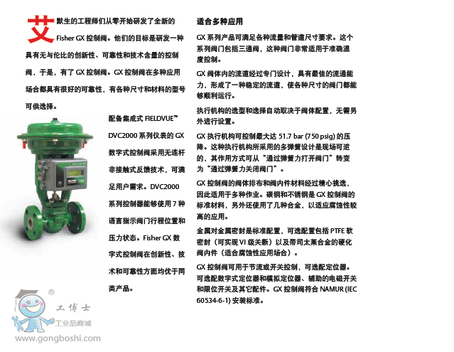 數字閥控制器。GX 產品配備 DVC2000 數字閥控制器。DVC2000 使用簡單、尺寸緊湊并且安裝方便。它將 4-20 mA 輸入信號轉換為氣動輸出信號,供給控制閥執行機構。儀表設置通過一個按鈕和液晶顯示器 (LCD) 界面進行。此界面封裝在密封機箱內,和環境隔開。界面支持多種語言,包括德語、法語、意大利語、西班牙語、中文、日文、葡萄牙語、俄語、波蘭語、捷克語、阿拉伯語和英語。
