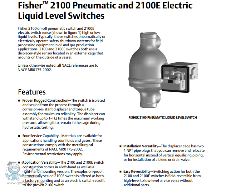 開關(guān)型 Fisher®2100 氣動(dòng)開關(guān)和 Fisher 2100E 電動(dòng)開關(guān)可感知高低液位。通常,這些開關(guān) 以氣動(dòng)或電動(dòng)方式操作石油和氣體生產(chǎn)應(yīng)用中現(xiàn)場處理設(shè)備的安全關(guān)閉系統(tǒng)。2100 和2100E 型開關(guān)均使用浮子浮筒傳感器,安裝在一個(gè)容器外部的外浮筒中。可用于酸性氣體:(NACE) MR0175。