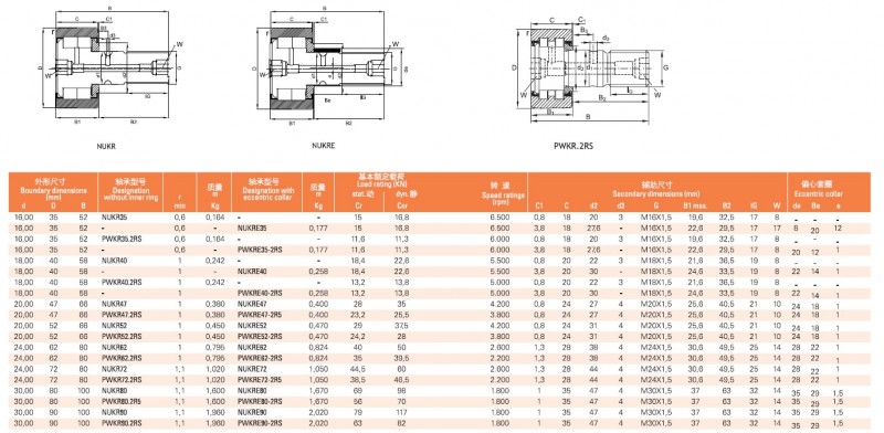 NBI螺栓型滾輪軸承有有以下三種系列:KR系列、NUKR系列、PWKR系列。同規格的三種螺栓型滾輪軸承具同樣的外形尺寸。差別只在于其內部設計,目的在于適應各種運行條件。所有型號均有一個套在螺栓軸上的同心底座或偏心套圈,相連接的部位具有較為嚴格的制造公差。可以調整的偏心值在產品一覽表中列出。