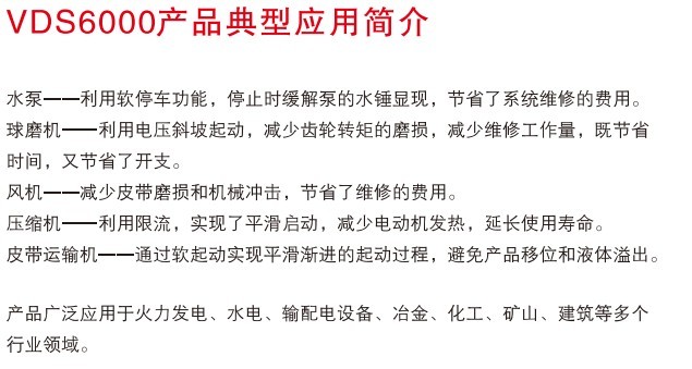 VDS6000系列智能型電機軟起動器是采用電力電子技術、微處理器技術及現代控制理論技術生產的具有當今國際先進水平的新型起動設備該產品能有效的限制異步電動機啟動時的起動電壓、電流。可廣泛應用于風機、水泵、扎碎機、球磨機、攪拌機、輸送類及壓縮機重載設備,是星/三角轉換、自藕降壓、磁控降壓等降壓啟動設備的理想換代產品。
