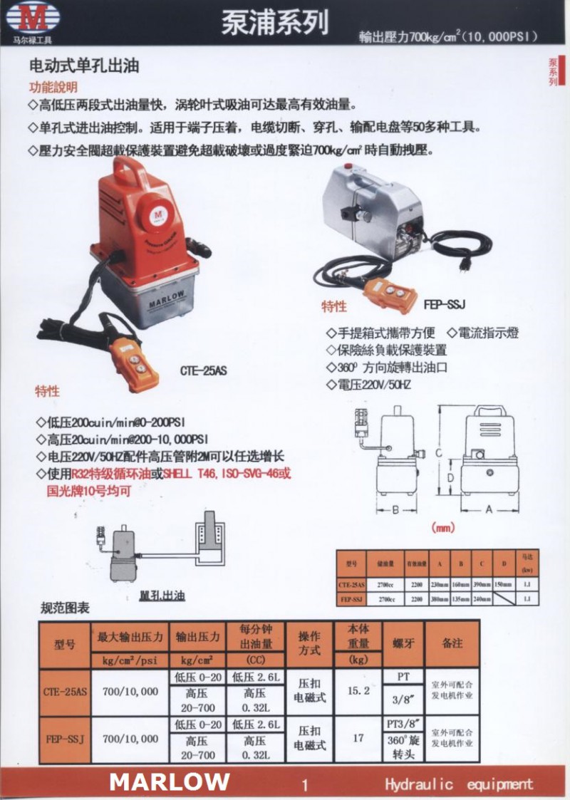 臺灣馬爾祿MARLOW單回路高壓電動泵CTE-25AS