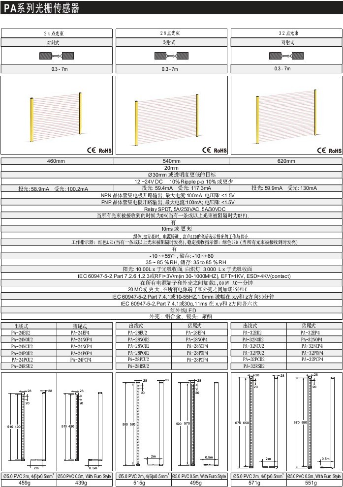 32/28/24點(diǎn)光束 0.3-7M 屏蔽 鋁合金,聚酯 標(biāo)準(zhǔn)型 漫反射、鏡片反射、對(duì)射 PA系列光柵傳感器