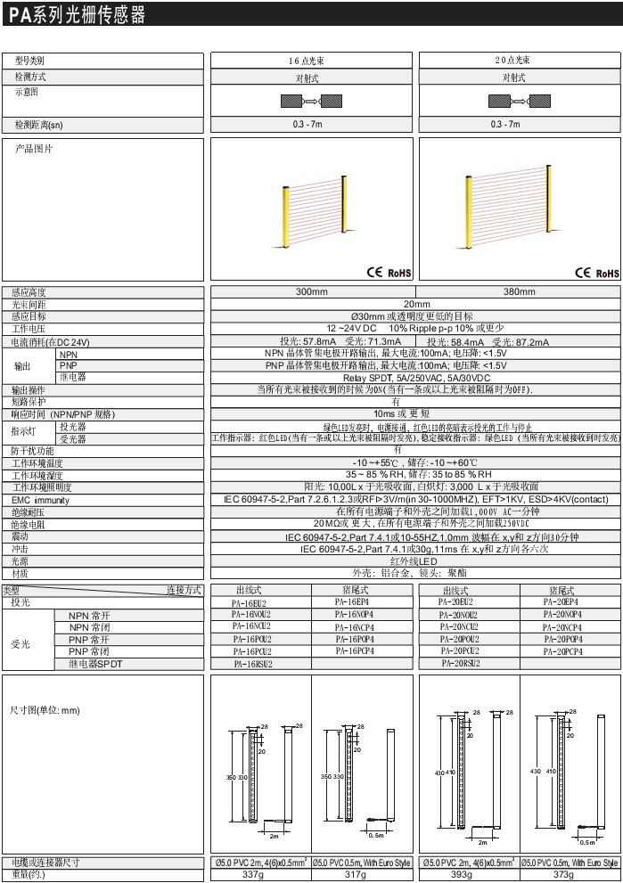 16/20點(diǎn)光束 0.3-7M 屏蔽 鋁合金,聚酯 標(biāo)準(zhǔn)型 漫反射、鏡片反射、對(duì)射 PA系列光柵傳感器