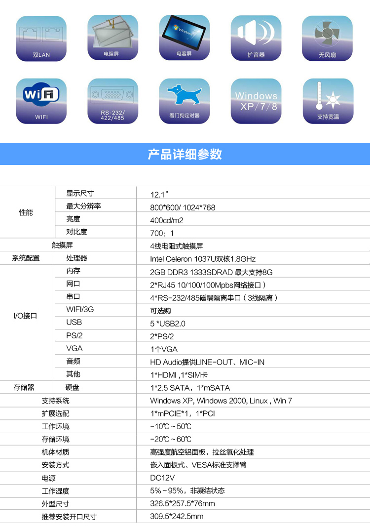 控匯12.1英寸電阻式觸摸屏 1037U 工業(yè)平板機(jī)