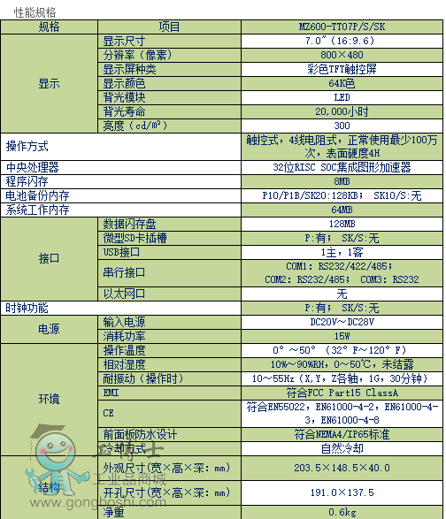 尺寸7.0"觸摸式真彩TFT65536色),有時鐘,內存8M+128MB閃存,128KB SRAMMicro SD800×4802個通訊口:COM1/COM3