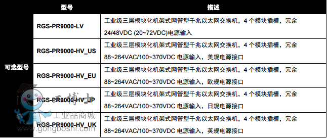 RGS-PR9000 系列模塊化網管型千兆以太網交換機,含 4 個模塊插槽。支持靜態路由,RIP 動態路由協議。支持多種網絡冗余協 議,O-Ring (自愈時間<30ms @ 250 臺交換機)、Open-Ring、O-Chain、MRP 和 MSTP (RSTP/STP),當網絡故障時可以迅速地恢 復,保證重要應用的不間斷通訊。除基于 WEB、Telnet、Console(CLI)行管理和配置外,ORing 還提供專業的 Open-Vision 網管軟 件,對交換機進行集中管理和配置。支持-40 ~ 85℃寬溫(10G SFP 模塊工作溫度為-20 ~ 60℃), 保證設備在惡劣環境下穩定運行。 因此,RGS-PR9000 是構建高效光纖冗余以太網的*佳選擇。