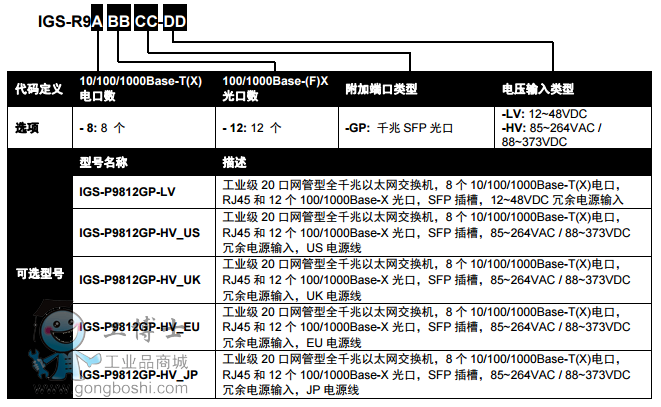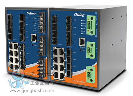IGS-P9812GP 工業級千兆網管型以太網交換機,提供 8 個 10/100/1000Base-T(X)電口,RJ45 和 12 個 100/1000Base-X 光口, SFP 插槽。符合 IEC 61850-3 和 IEEE 1613 標準,可適用于變電站環境;符合 EN50155 標準,可用于軌道交通應用。支持多種網絡 冗余協議 O-Ring (自愈時間<30ms @ 250 臺交換機)、Open-Ring、O-Chain,MRP 和 MSTP (RSTP/STP),當網絡故障時可以迅速 地恢復,保證重要應用的不間斷通訊。此外,支持-40 ~75℃寬溫,保證設備在惡劣環境下穩定運行。除基于 WEB、Telnet、 Console(CLI)進行管理和配置外,ORing 還提供專業的 Open-Vision 網管軟件,對交換機進行集中管理和配置。因此,IGS-P9812GP 系列交換機是構建高效以太網的*佳選擇。
