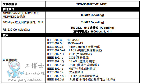 ORing Transporter™系列網(wǎng)管型以太網(wǎng)交換機(jī)專為軌道交通應(yīng)用而設(shè)計(jì)。TPS-B3082ET-M12-BP1網(wǎng)管型以太網(wǎng)交換機(jī),符 合EN50155標(biāo)準(zhǔn),8個(gè)10/100Base-T(X) M12 PoE端口,支持IEEE802.3af 標(biāo)準(zhǔn),每個(gè)電口*大15.4W輸出;以及2個(gè)提供旁路 功能的以太網(wǎng)距離延長(zhǎng)端口,*高可提供200m長(zhǎng)距離傳輸。支持多種網(wǎng)絡(luò)冗余協(xié)議 O-Ring (自愈時(shí)間<10ms @ 250臺(tái)交換 機(jī))、Open-Ring、O-Chain和MSTP (RSTP/STP),當(dāng)網(wǎng)絡(luò)故障時(shí)可以迅速地恢復(fù),保證重要應(yīng)用的不間斷通訊。此外,支持-40 ~70℃寬溫,保證設(shè)備在惡劣環(huán)境下穩(wěn)定運(yùn)行。除基于Web和Console(CLI)進(jìn)行管理和配置外,ORing還提供專業(yè)的Open-Vision 網(wǎng)管軟件,對(duì)交換機(jī)進(jìn)行集中管理和配置。因此,TPS-B3082ET-M12-BP1系列交換機(jī)是軌道交通應(yīng)用中構(gòu)建高效以太網(wǎng)的*佳 選擇。