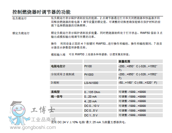 帶有模擬輸出端的固定調節器。可利用控制 2 級燃燒器的 2 點調節器外部開關進行切