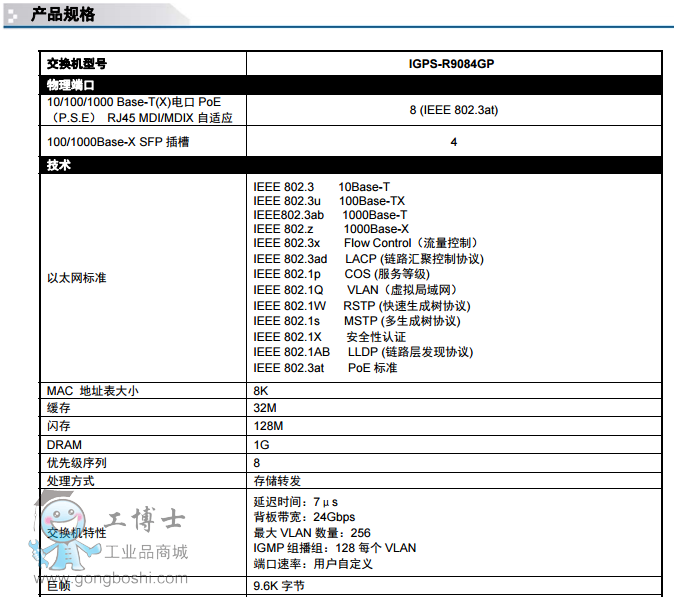地恢復,保證重要應用的不間斷通訊。IGPS-R9084GP系列符合IEEE802.3 at協議,每個端口提供*大30W輸出。此外,支持-