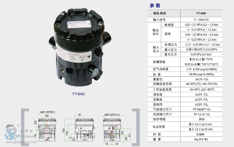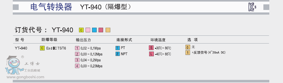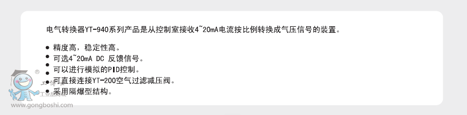 電氣轉換器YT-940系列產品是從控制室接收4~20mA電流信號,按比例轉換成氣壓信號的裝置。
