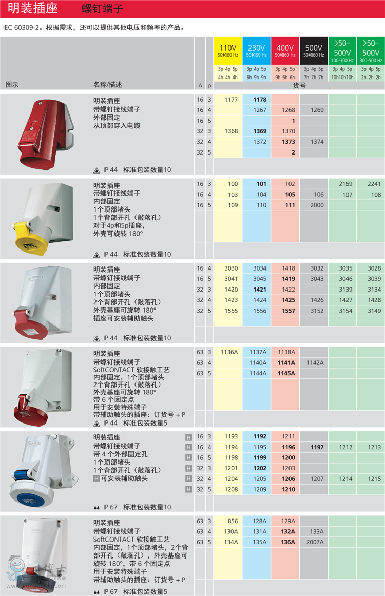 業(yè)用插頭、插座和電纜連接器,組合插座箱,照明配電箱、檢修電源箱、動(dòng)力配電柜、冷藏箱插座屏等產(chǎn)品。