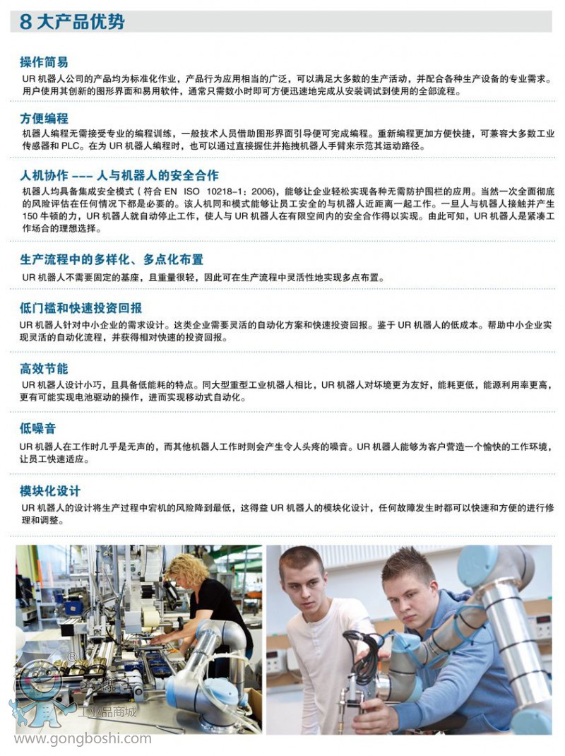來自丹麥的Universal Robots’(UR)(優傲)機器人有著一般工業機器人的不同的優勢,帶力矩傳感,不用安全圍欄,體積輕巧,方便運輸,手動移動機器人示教。新開發機械臂UR5給機器人市場帶來了革新。