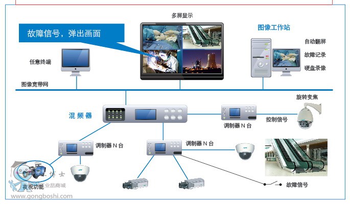 寬帶多媒體監控系統將生產現場圖像、聲音及報警信號就地上網,通過網絡遠距離、實時地傳輸給監控中心,在監控中心把圖像上傳給因特網或局域網。監控中心的顯示終端對現場圖像進行遙視、控制、聯動現場攝像頭云臺的旋轉,鏡頭的可變調節,從而使在控制室的監控如同身臨現場般真切。
