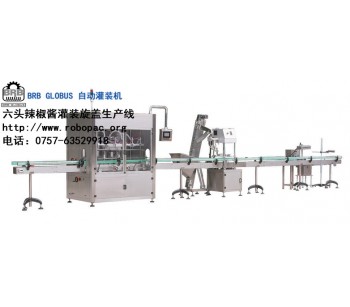 BRB GLOBUS品牌BRB-106全自動六頭辣椒醬灌裝生產線/全自動六頭辣椒醬灌裝機由活塞式灌裝機、旋蓋機、雙面自動貼標機組成。生產線具有瓶型自動檢測功能(有瓶灌裝,無瓶不灌裝),灌裝(灌裝計量可調節),自動落蓋、旋蓋、貼標等功能。整線運行穩定、噪音低、成品率高、維修方便,安全可靠。廣泛適用于調味品、食品、化妝品、日用化工用品、醫藥等行業的扁瓶、橢圓瓶類容器包裝,是完全符合GMP生產規范的理想包裝設備。