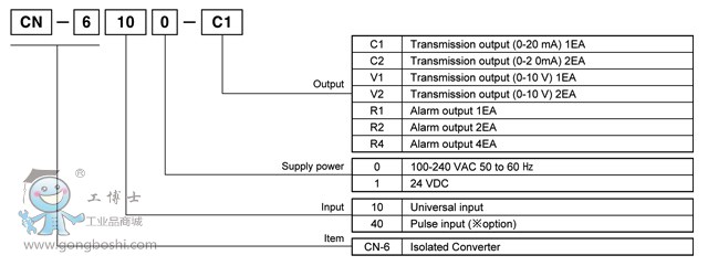 0-20mA(可調(diào)輸出范圍),負(fù)載電阻Max.600Ω(精度:±0.3 F.S.,分辨率:8000) |
