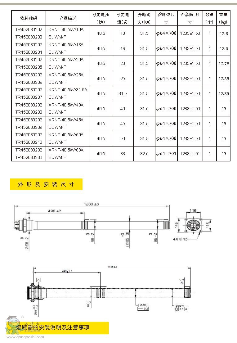 本產品為高壓全范圍型限流熔斷器,適用于戶內交流50HZ,額定電壓40.5KV的電力系統,作為電力變壓器及其它電力設備的過載和短路保護。