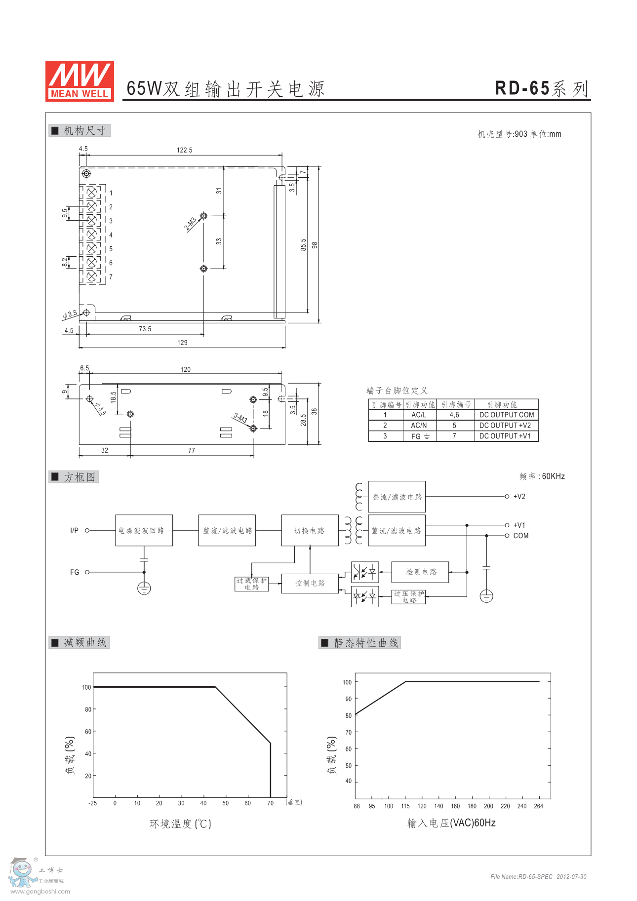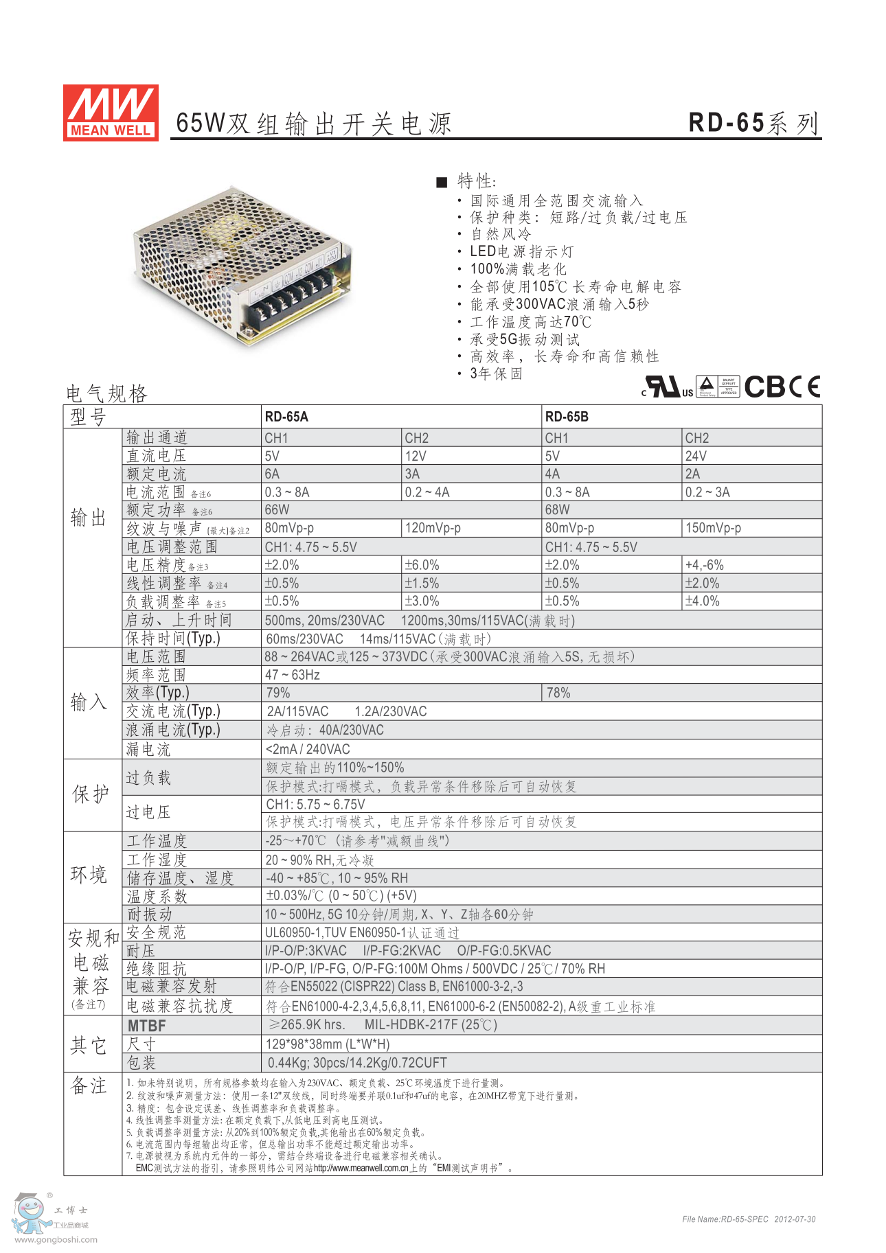 明緯RD-65A 65W雙組輸出開關(guān)電源 G3系列
