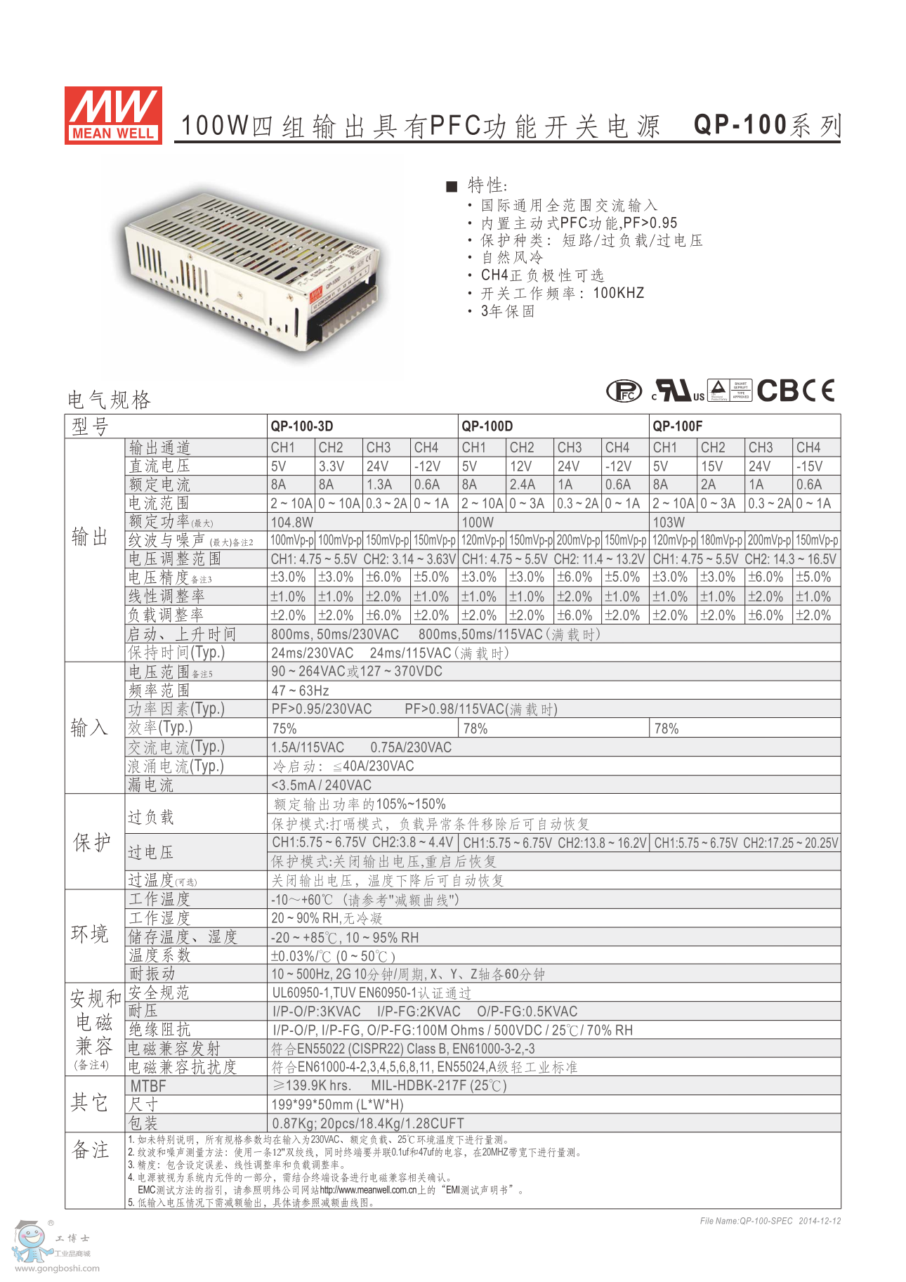 明緯QP-100-3A 100W四組輸出有PFC功能開關電源 PFC系列 |