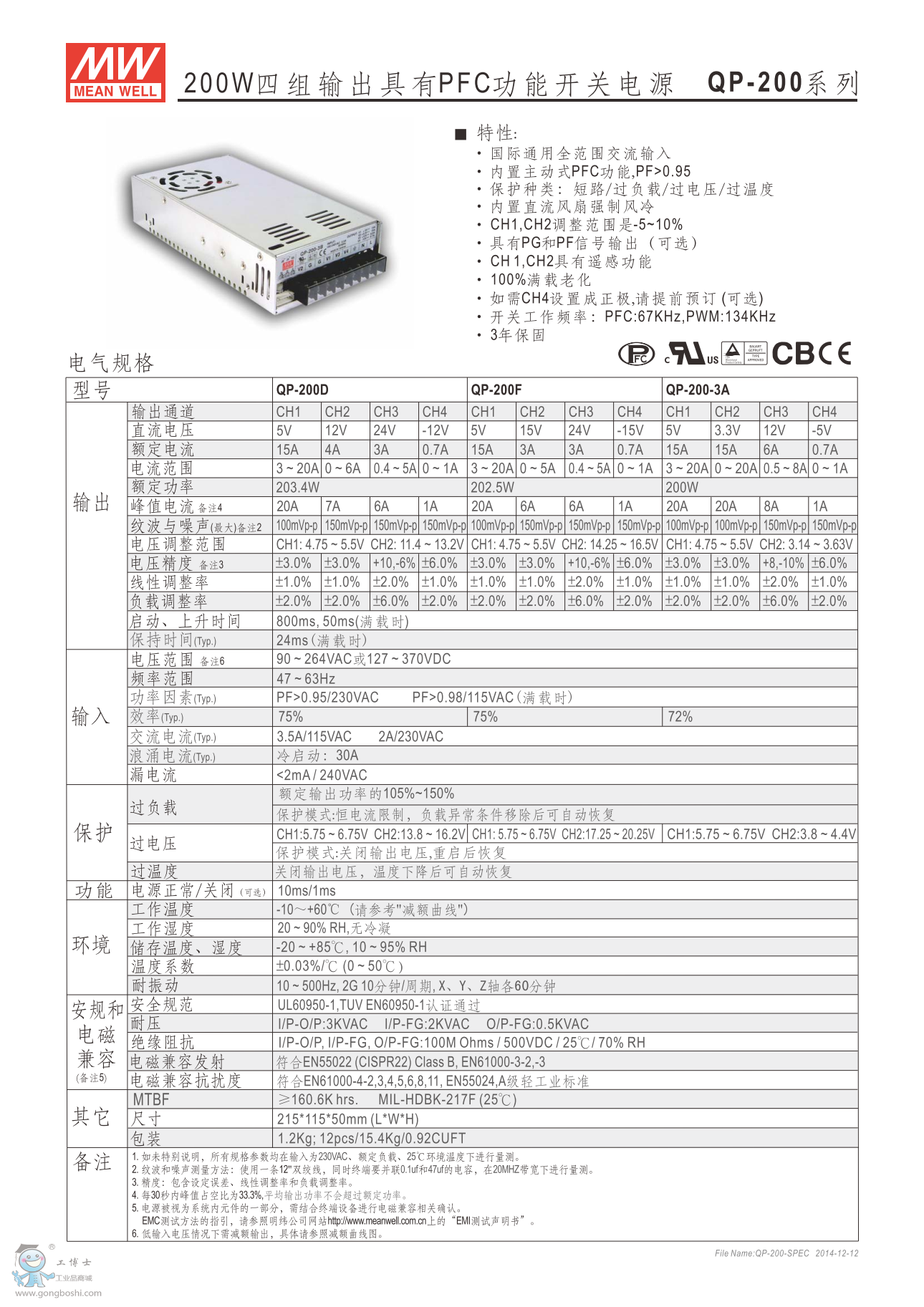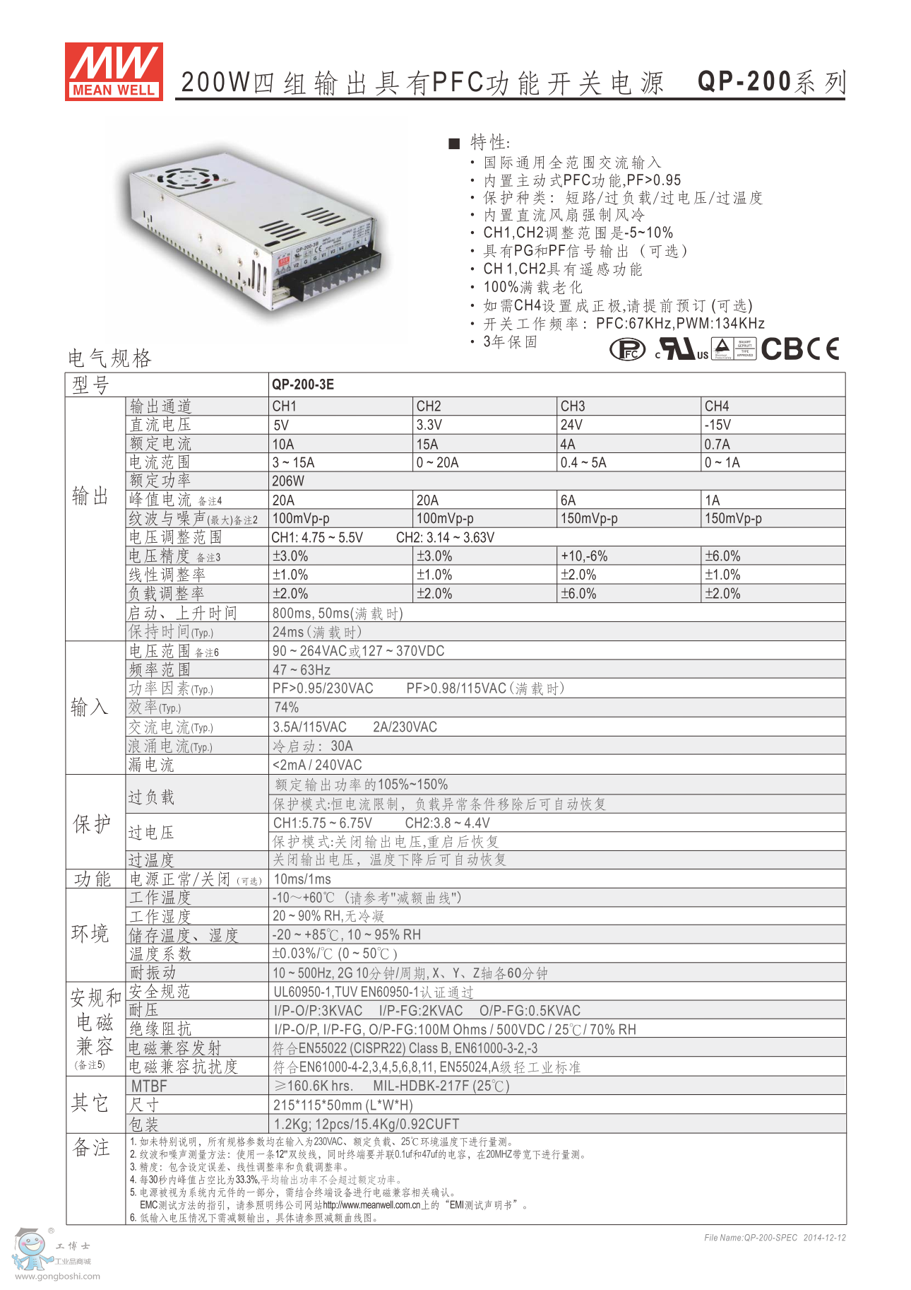 明緯QP-200-3A 200W四組輸出有PFC功能開關電源 PFC系列 |