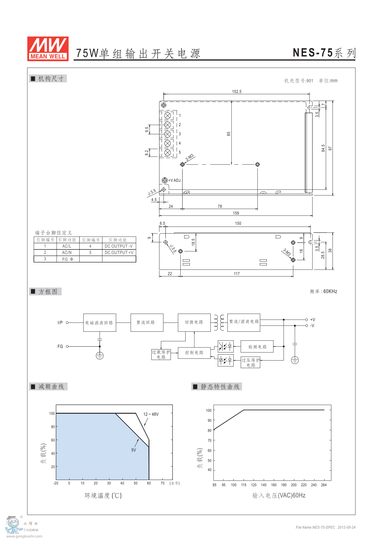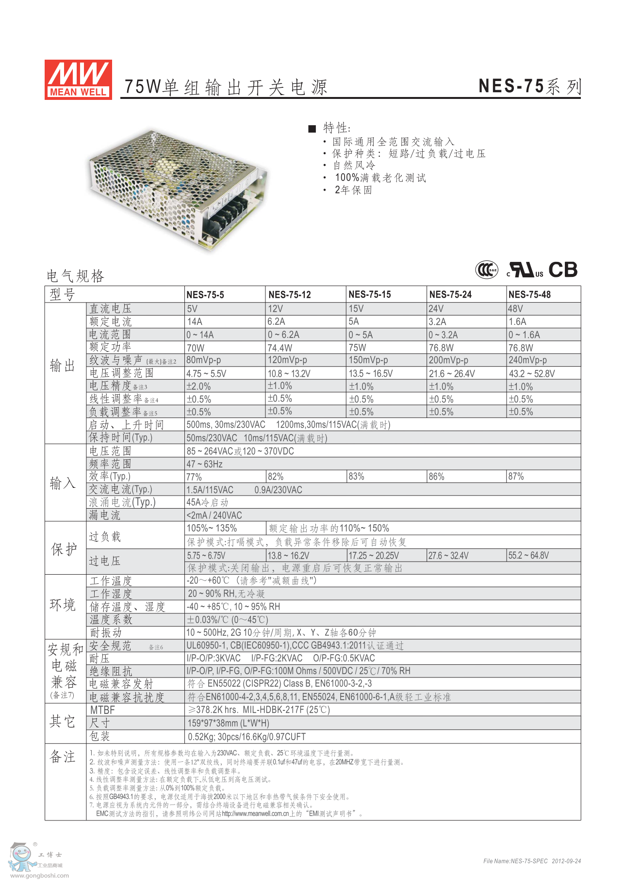明緯NES-75-12 75W單組輸出開關電源 NE系列