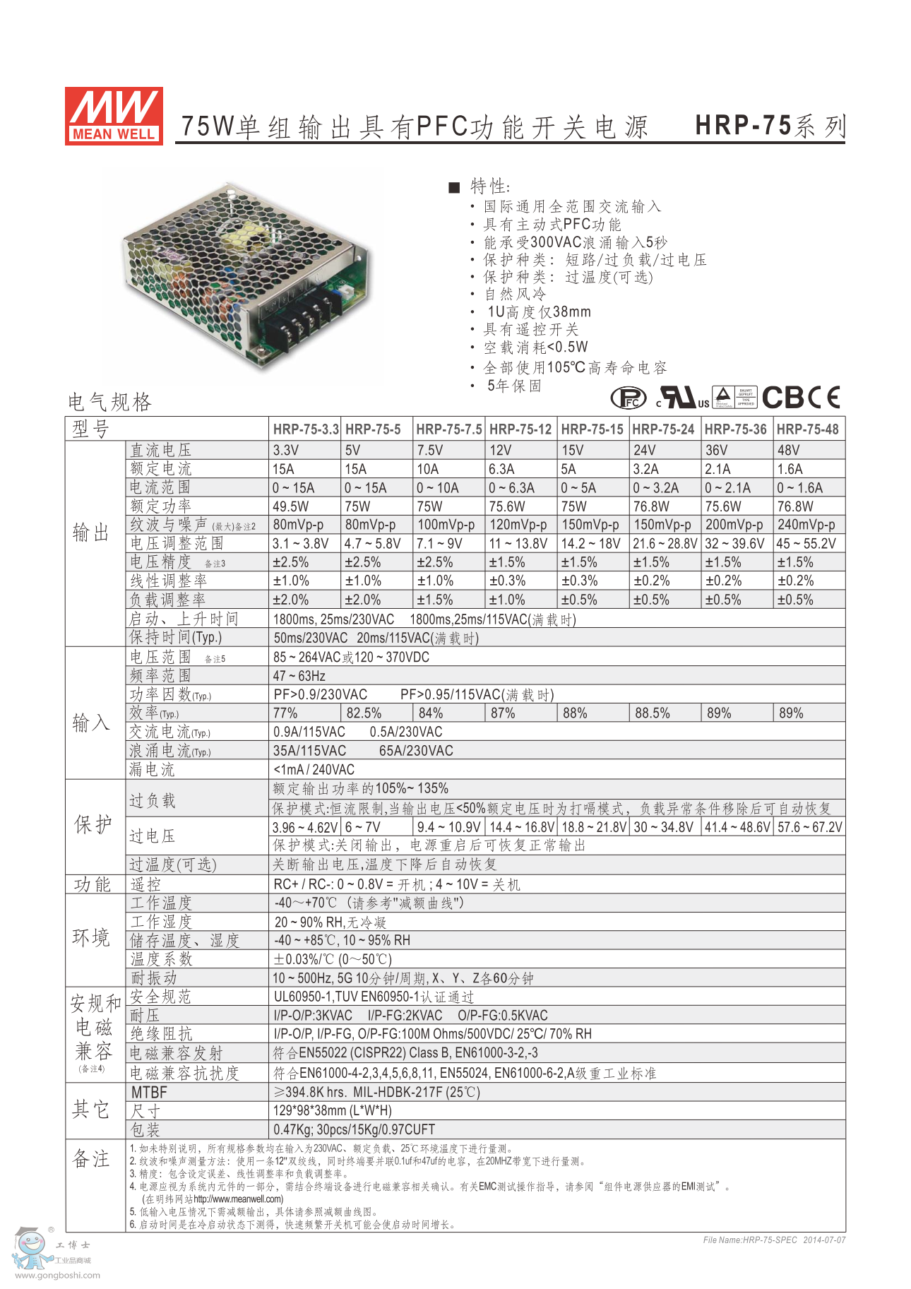 明緯電源HRP-75-12 75W單組輸出有PFC功能 HRP系列