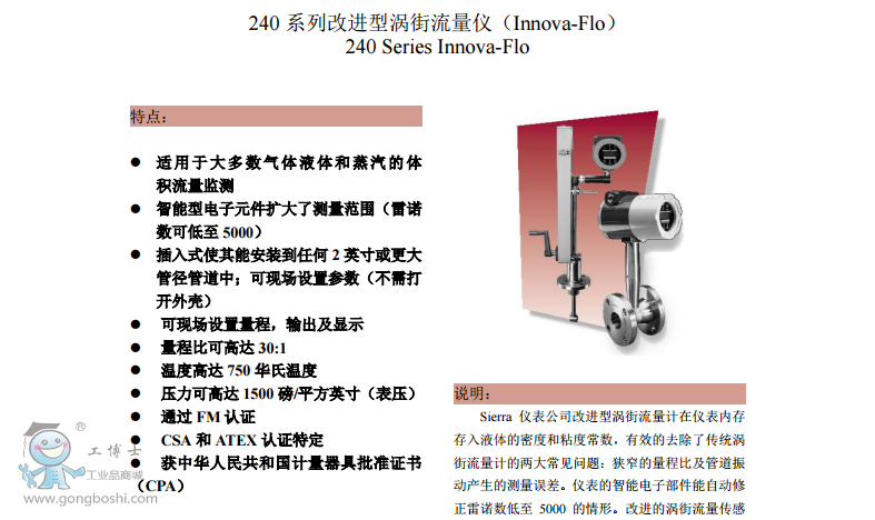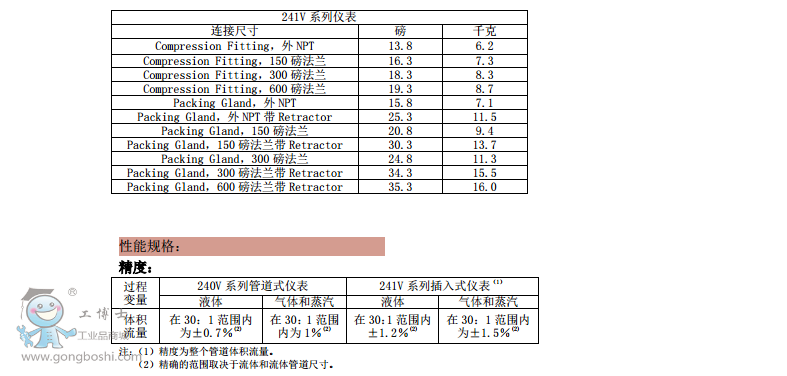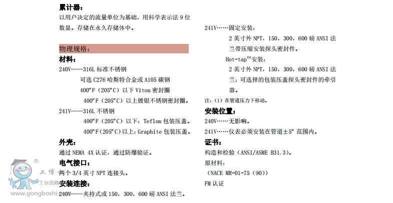 在量程比 30:1的范圍內,產品精度液體為± 1.2%、氣體和蒸汽為1.5% 。 241型號在危險領域通過FM, CSA, ATEX 和 CE認證