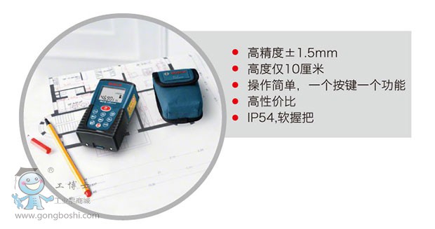 激光二極管:635 nm,<1mW;測量范圍:0.05-40m;激光級別:2;測量精度:士1.5 mm;典型測量時(shí)間:< 0.5 s;電源:4 x 1.5 V LR03 (AAA);長度:100 mm;高度:32 mm;